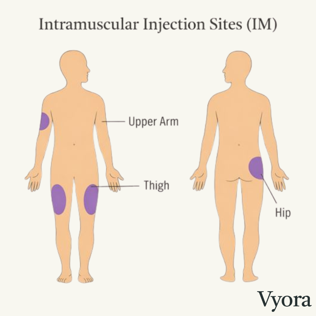 • Hip (Ventrogluteal muscle) – Located on the side of the hip, slightly above and forward of the buttock. Often preferred by clinicians due to lower risk of nerve or blood vessel injury.